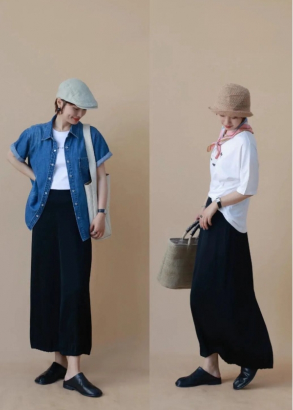 40岁女人的衣橱里,不需要准备太多的衣服,懂得打造"胶囊衣橱"才是聪明女人。基础简约的衬衫、T恤,搭配上纯黑色的半身长裙,用配饰点亮造型,照样拥有精致感。