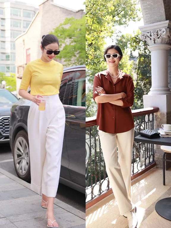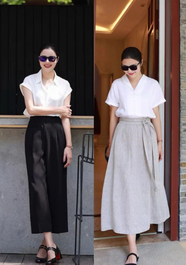 相比起一些很繁琐的设计,简约利落的服装单品,穿到身上后更有气质。直线条长裙、九分裤,不仅可以拉长身形比例,而且对于身材的包容性也很高,能够轻松遮住赘肉感。