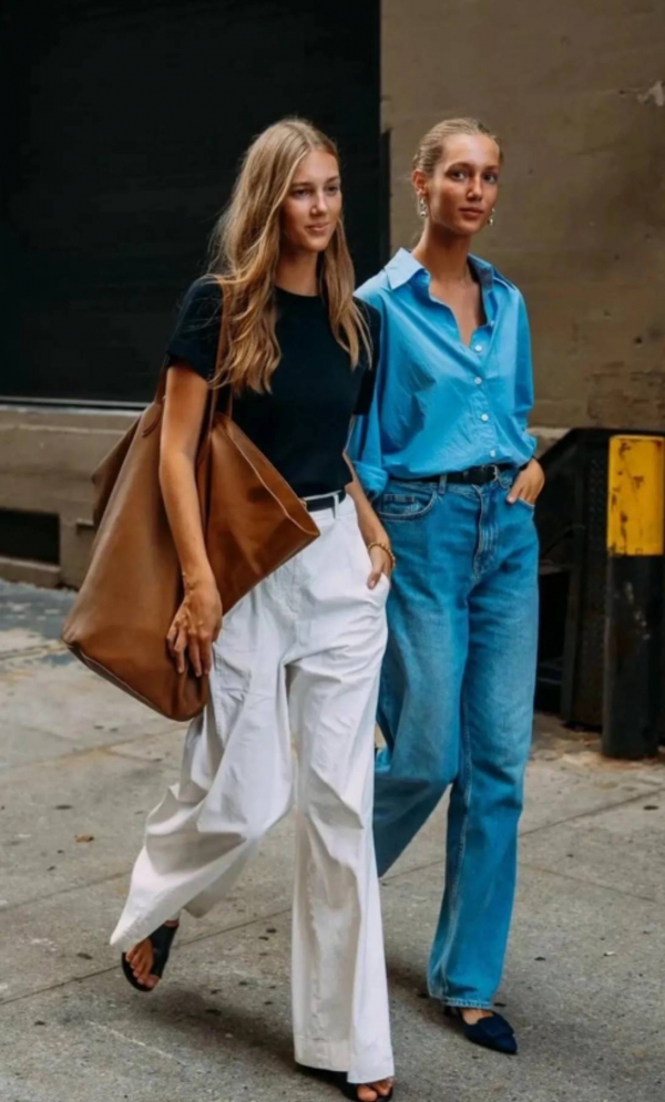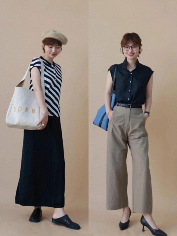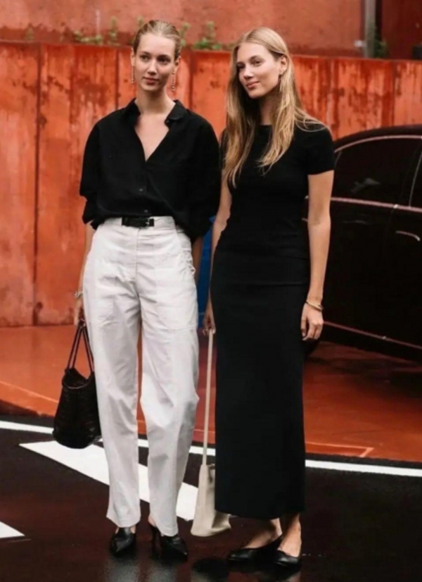 黑白色是永不出错的选择,黑色衬衫搭配白色阔腿裤,帅气又高级。纯黑色的修身连衣裙,直接踩上一双浅口平底鞋,就能帮助你修出好身材,佩戴上金属材质的首饰,尽显高级感!