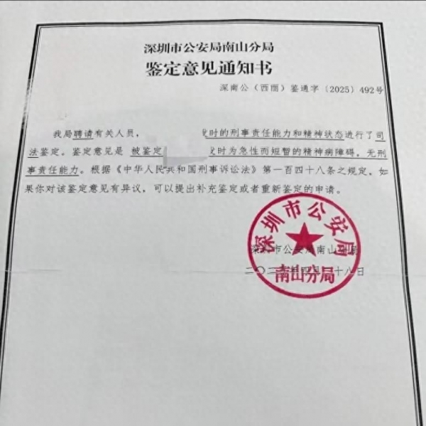带着这份沉重的不安,李黎向 "局长信箱" 投诉。4 月 28 日,南山分局出具鉴定意见通知书,判定嫌疑人案发时处于 "急性而短暂的精神病障碍,无刑事责任能力"。