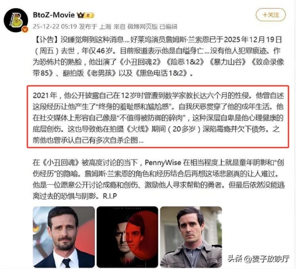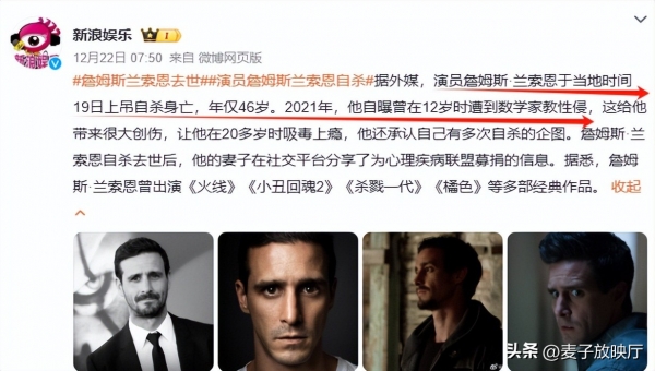 46岁的詹姆斯·兰索恩就这么走了,留下了妻子和两个孩子,留下了没拍完的戏。希望那些还在黑暗中挣扎的人,能得到更多温暖和帮助。