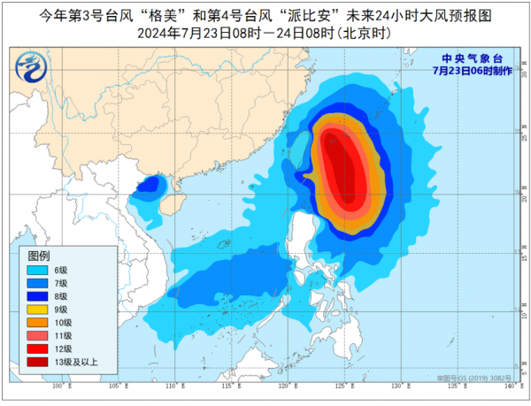 大风预报:7月23日8时至24日8时,东海南部及钓鱼岛附近海域、台湾海峡、台湾以东洋面、巴士海峡、南海中南部及南沙群岛附近海域、北部湾西北部海域以及广西西南部沿海、台湾岛东部和北部沿海将有6至7级大风,其中台湾以东洋面的风力有8至10级,部分海域风力可达11至13级,"格美"中心经过的附近海面的风力有14至15级,阵风16至17级。
