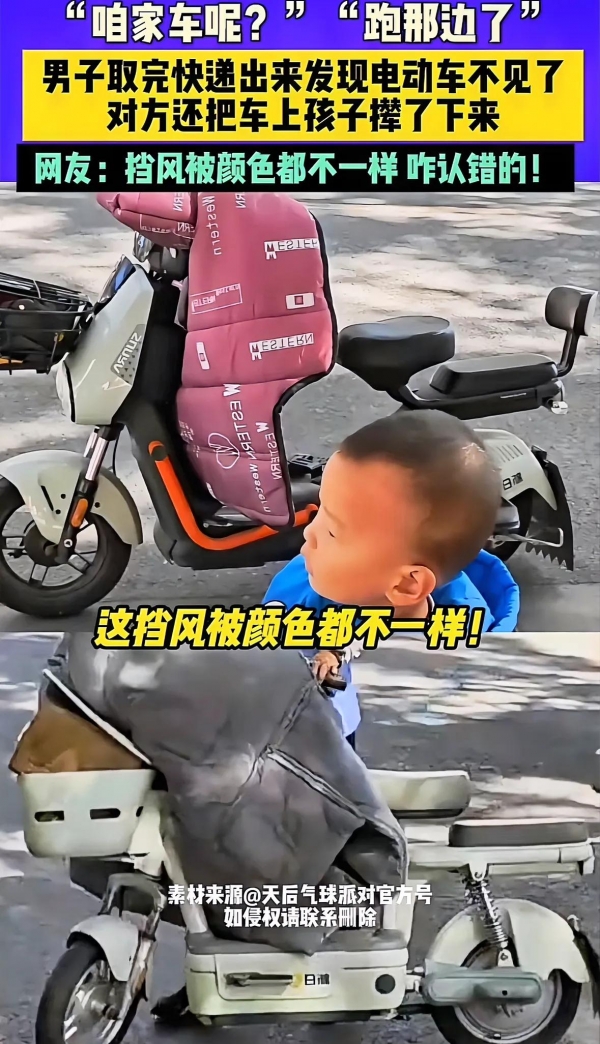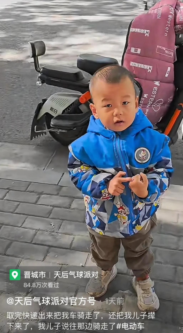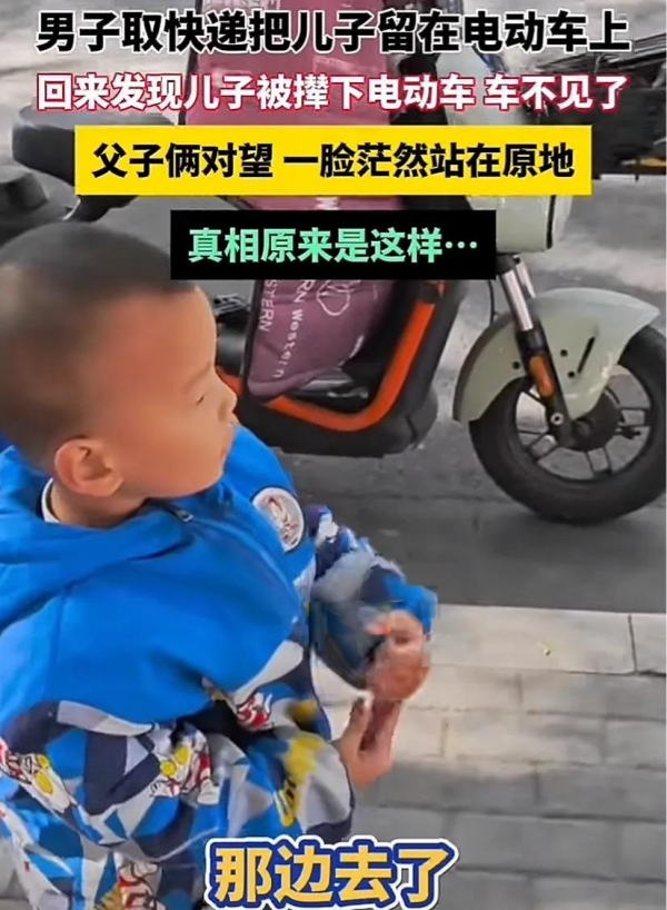 近日山西一快递点发生了搞笑的事。有位父亲去取快递,把五岁儿子留在电动车上自己进屋。等他出来发现电动车没了,儿子却好端端站在路边。爸爸问车哪去了,儿子说有人把他推下车,开着车往远处走了。