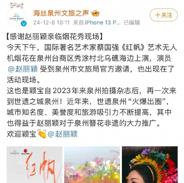 这一趟烟花秀,是赵丽颖受邀来泉州的,因为她之前拍杂志时大力推广泉州非遗文化,尤其是簪花这项传统艺术。泉州的官方就表示,赵丽颖不仅在事业上是一位成功的演员,也是一位积极推动文化传播的公众人物。