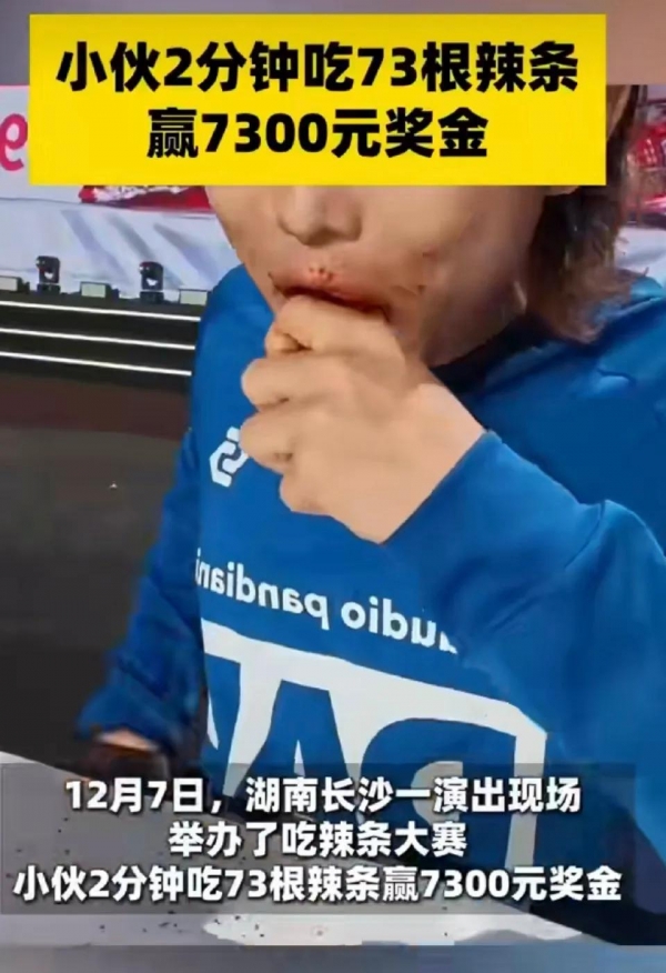 当舞台上的计时器开始跳动,十位年轻人抓起辣条疯狂吞咽,台下欢呼与倒吸冷气的声音交织在一起。两分钟,73根辣条,7300元现金--这是一场发生在长沙某演出现场的"极限挑战",也是一面折射当代青年生存状态的镜子。