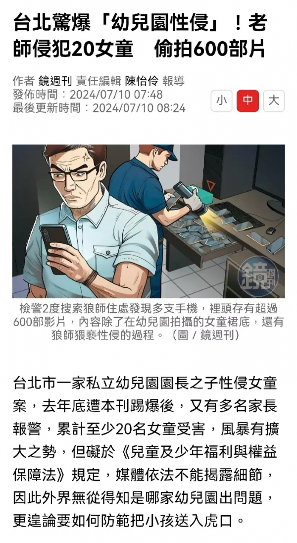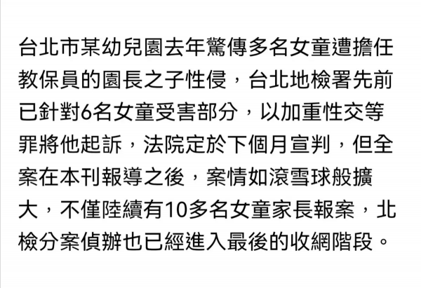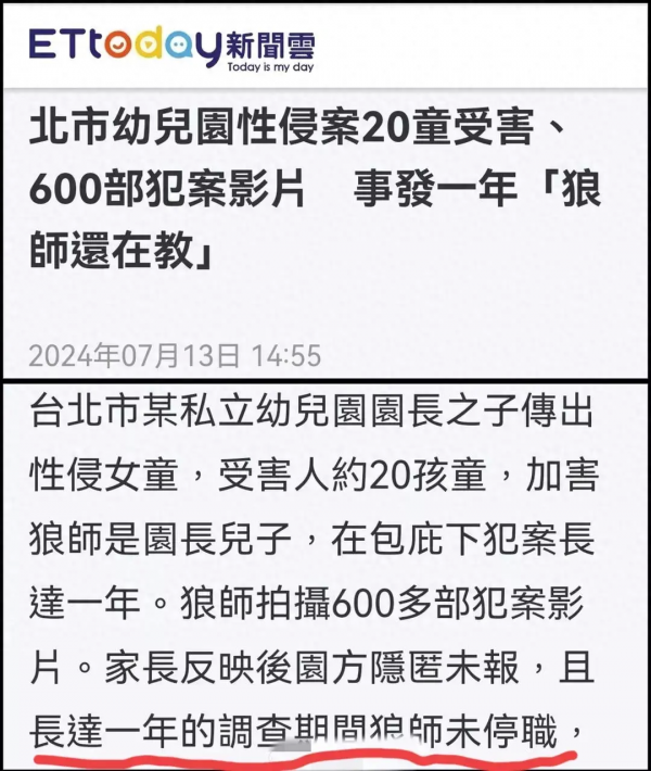 近日,据多家媒体报道,台北市一私立幼儿园教师,也是园长之子,涉嫌侵犯20余名女童,拍摄600多部犯案影片,诸多细节令人愤怒。