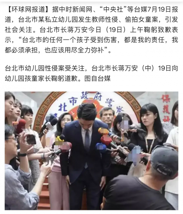 最新进展是,案件侦办正在收网阶段,7月19日,市长向受害女童家长鞠躬道歉:台北的任何一个孩子受到伤害,都是我的责任,我都必须承担,会尽全力弥补…