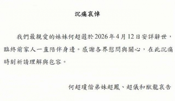 离世的时候,他的家人都陪伴在左右。至于离世的原因,讣告中没有过多透露。但据外界猜测,何超蕸大概率是因病离世。