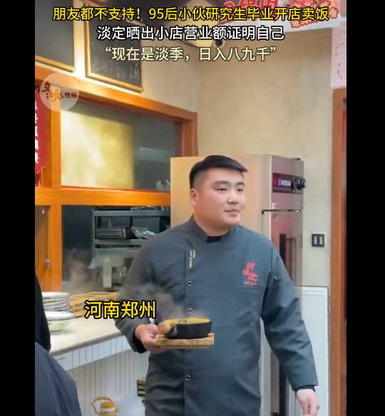 硕士毕业后送过外卖,做过自媒体,如今又开了家小饭店。27岁河南小伙张硕的选择,让很多亲友"难以理解"。然而,更令人意外的是,在大学当老师的女朋友也毅然辞掉工作,来到饭店和他一起经营。"河南大学研究生毕业后,很多同学都选择考公,基本上只有我选择创业。所以刚开始很多人都不理解我的做法。"张硕说。如今,在他和女友的共同努力下,小店生意越来越好,月均营业额稳定在28万元左右。"店才开了一年多,我们就攒够了结婚的费用。经济条件应该比大多数同学好一些吧。"张硕笑着说。