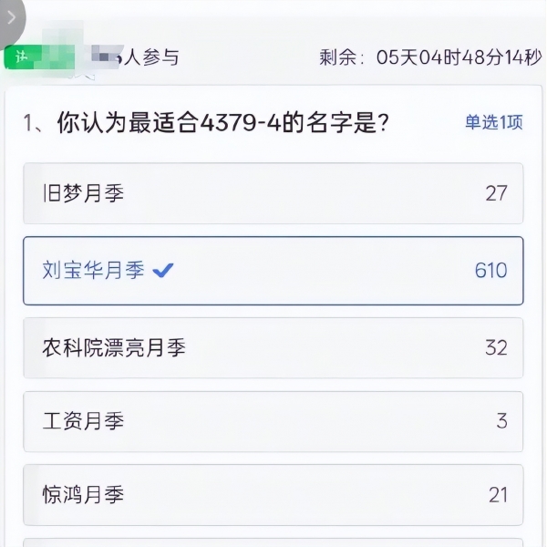 12月23日,@上游新闻 记者查看了发起本次月季征名活动的社交账号"植物眼",该账号在12月20日发布信息称:"决定采用'宝华月季'这个名称作为月季新品种4379-4的申报名,感谢大家,感谢@有之 的二舅。"