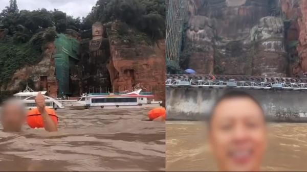 在距离乐山市高新区不远的乐山三江汇流处,同样活跃着"洪水泳者"的身影。据报道,近日此处有多位游泳爱好者,一边在暴雨中与洪水搏击,一边拍摄乐山大佛。