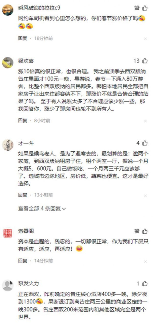 还有网友尖锐指出,西双版纳的乱象不是个例,节假日涨价已经成为很多旅游城市的通病,从酒店到餐饮,从景区到交通,一到假期就坐地起价,把游客当冤大头。