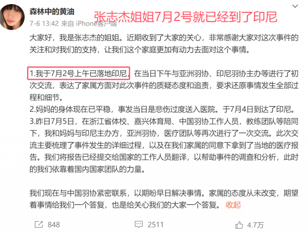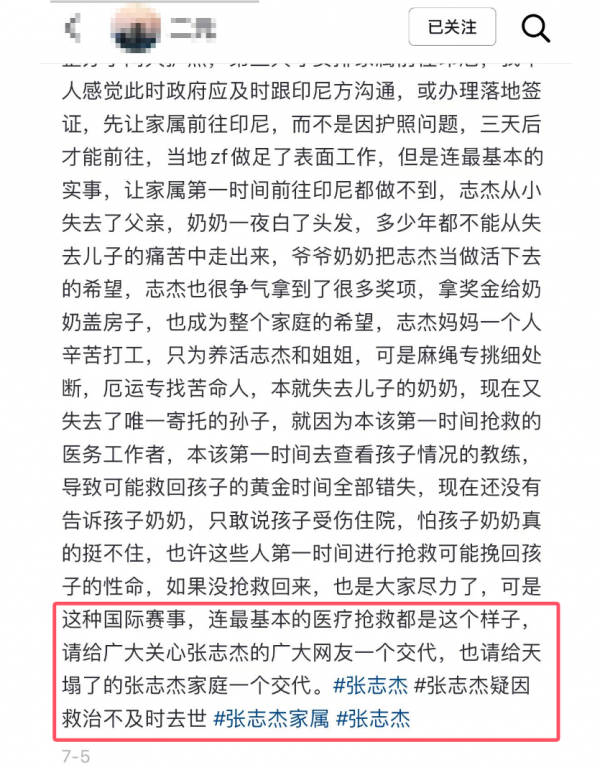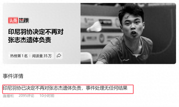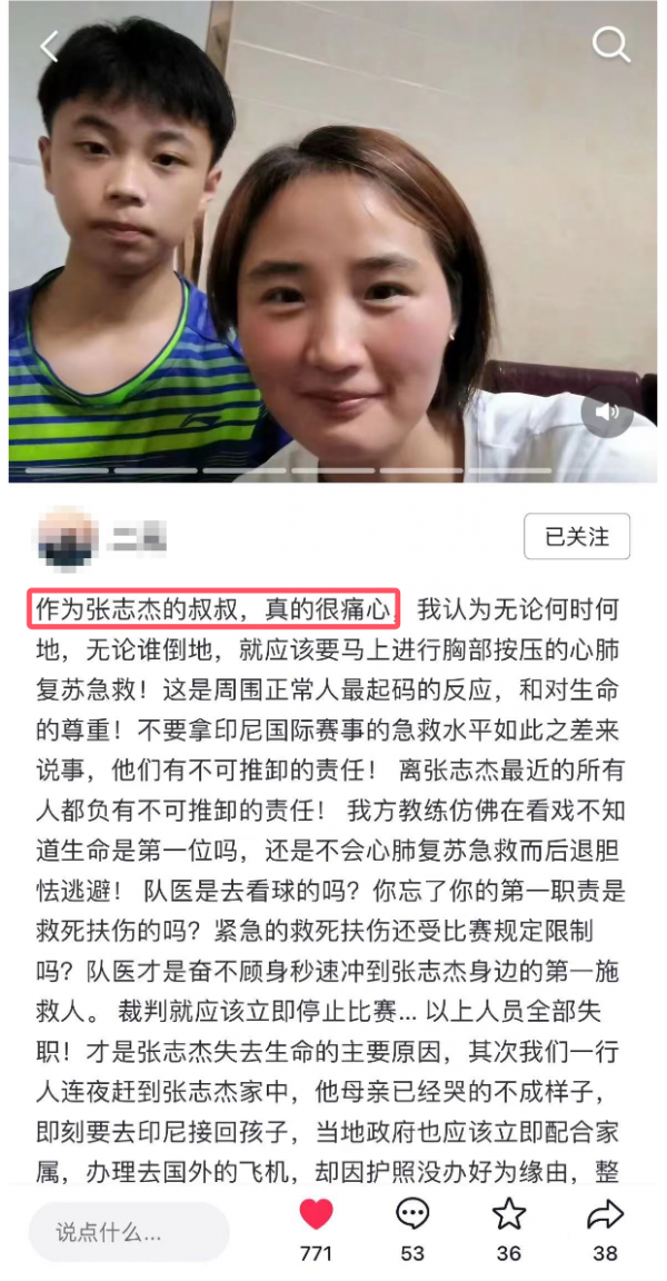 张志杰的叔叔此前发长文控诉印尼羽协不作为,错过了张志杰的黄金抢救时间,对赛事的医疗措施提出了质疑,引发不小的热议。