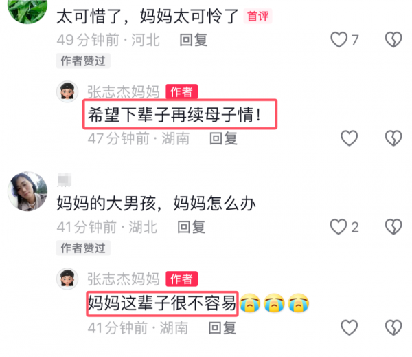 张志杰妈妈说这一辈子自己太不容易,但还是希望下辈子可以和张志杰再续母子情。同时,张志杰的母亲还表示儿子的遗体仍在国外,并没有运回来。