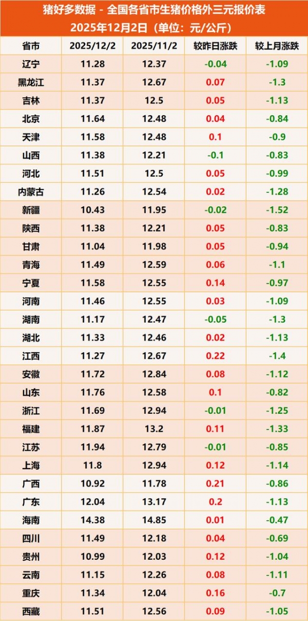 近日,猪肉市场的热度似乎又被点燃了。连续两天,生猪价格稳步攀升,尤其是在南北方,猪价普遍出现了明显的上涨趋势。根据最新监测数据显示,12月2日,全国外三元生猪平均价格达到了11.53元每公斤,比前一天上涨了0.06元。叠加昨天的涨幅,短短两天,猪价累计上涨了0.14元,似乎预示着一股涨势的到来。