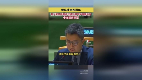 当地时间24日,联合国大会第十一届紧急特别会议复会,通过题为"支持乌克兰实现持久和平"的决议草案,该决议草案获得107票赞成、12票反对、51票弃权,中方投弃权票。中方表示,乌克兰问题已进入推动谈判解决的关键阶段,希望国际社会为政治解决创造有利条件,并期待联大在凝聚会员国和平共识方面发挥建设性作用。