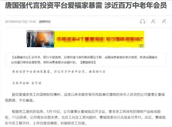 他代言了"爱福家"养老投资平台,看在他的知名度上,很多老年人将毕生积蓄都投了进去。
