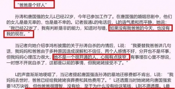 后来,唐在采访中却表示,孙患有精神病,这才是她自杀的主要原因。