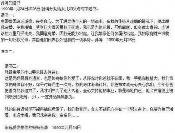她留下了两封遗书,控诉唐的不道德,致使她精神极度痛苦,并且她告诉女儿一定要给她报仇。