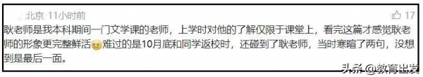 耿波老师的一位学生称,耿老师是自己本科期间的一门文学课老师,在上学的时候对他的了解仅限于课堂上,看完悼念内容后,才对耿老师的形象有了更完整鲜活的样子。