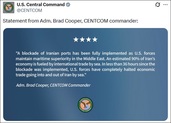 声明称,美军对伊朗港口的封锁已全面实施。在封锁实施不到36小时内,美军已完全切断伊朗海上进出口贸易。