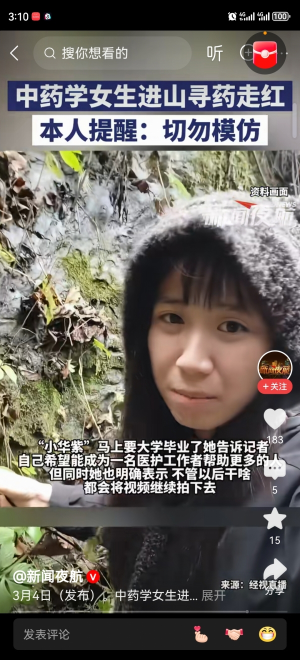 最近有个叫小华紫的博主靠着上山找野药的视频火了。她的账号点赞破百万,单条视频最高有62万赞。3月3号记者联系到她,她真名姓吴,是湖南怀化的中药学大学生。