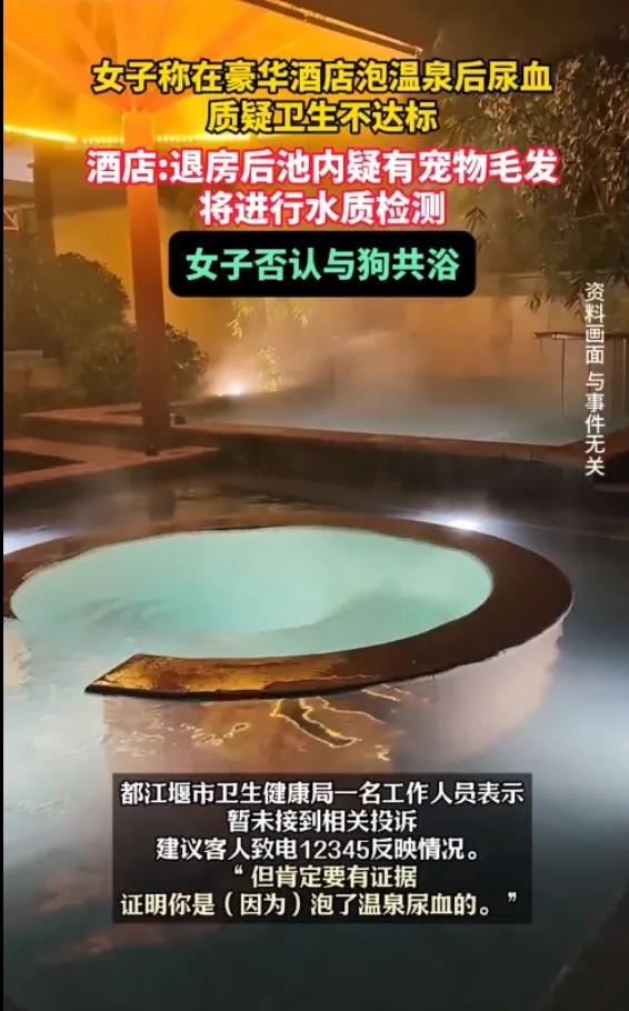 前几天网上有个热搜,说都江堰有女生泡温泉后尿血。她自己说花了好几千住酒店,泡完第二天就出现血尿,医生说是泌尿感染。她还带了狗进去,但强调没让狗下水。