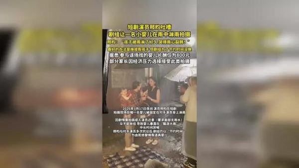 1月17日,有短剧演员吐槽某剧组夜里拍雨戏,一直让孩子淋洒水车那种瓢泼大雨。她透露因为要拍近景,她和对手女演员脸上不能有雨,所以伞不能放低,最好的解决办法是拍她们的时候把孩子换成假孩子,但是剧组为了节约时间就没有换,"孩子被雨淋了好久,哭得撕心裂肺"。据媒体报道,该场戏婴儿的片酬仅800元,部分家长因经济压力接受此类拍摄。