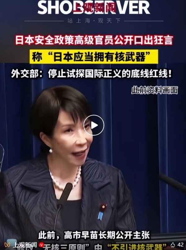 日前日本首相官邸一名负责安保政策的高官宣称日本应该拥有核武器,相关言论被披露后,遭到了日本各界的强烈批评。