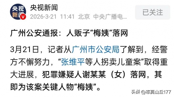 就在3月21日,央视新闻发布重磅消息:广州警方已成功抓获潜逃多年的拐卖儿童关键嫌疑人"梅姨",其真实身份为谢某,目前已被依法逮捕,并在审讯中对贩卖儿童犯罪事实供认不讳。