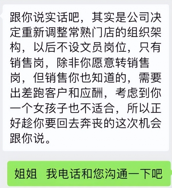 之后,他们的关系开始就有些微妙了。人事在通知她必须离职时,甚至提到:"你也不适合销售,我们正好借这个机会跟你谈。"
