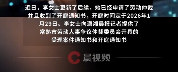 李女士随后向常熟市劳动人事争议仲裁委员会申请了仲裁,仲裁机构已发出开庭通知,庭审时间定于2026年1月29日。
