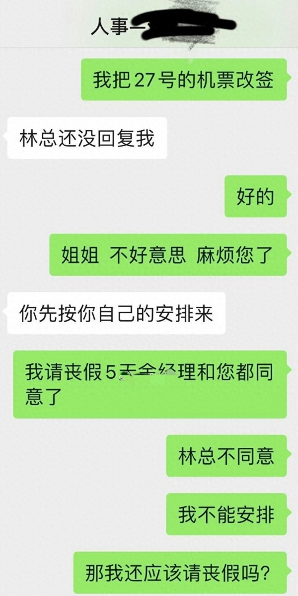 一开始对方还表示理解,并口头通过了申请,她也购买了高铁票回家处理丧事。