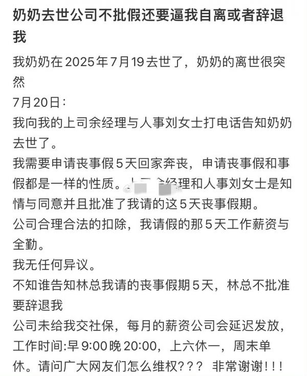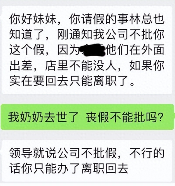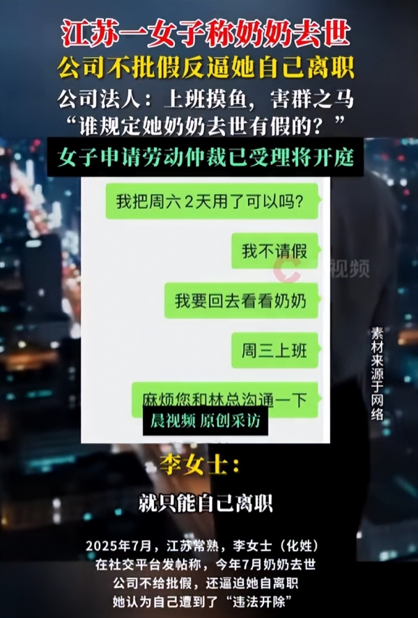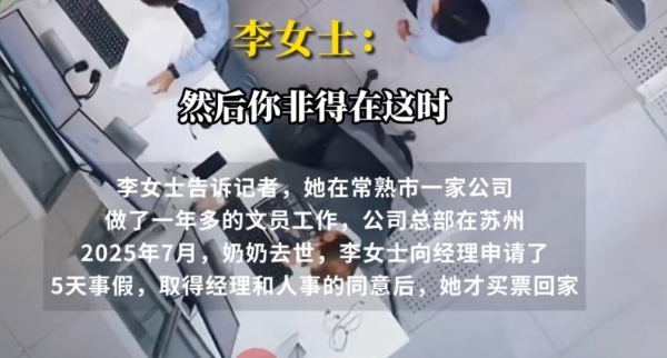 今年7月份的时候,江苏常熟李女士的奶奶去世了,她请了几天假准备回家,结果人刚坐上高铁,公司突然变卦,不批假了,还让她要么辞职,要么被开。