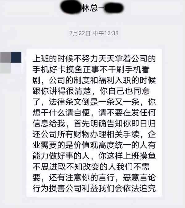 面对网上的舆论,涉事公司的法人林某也并未避讳,在回应媒体采访时,他直言:"她上班就是天天玩手机摸鱼,在公司是害群之马。"