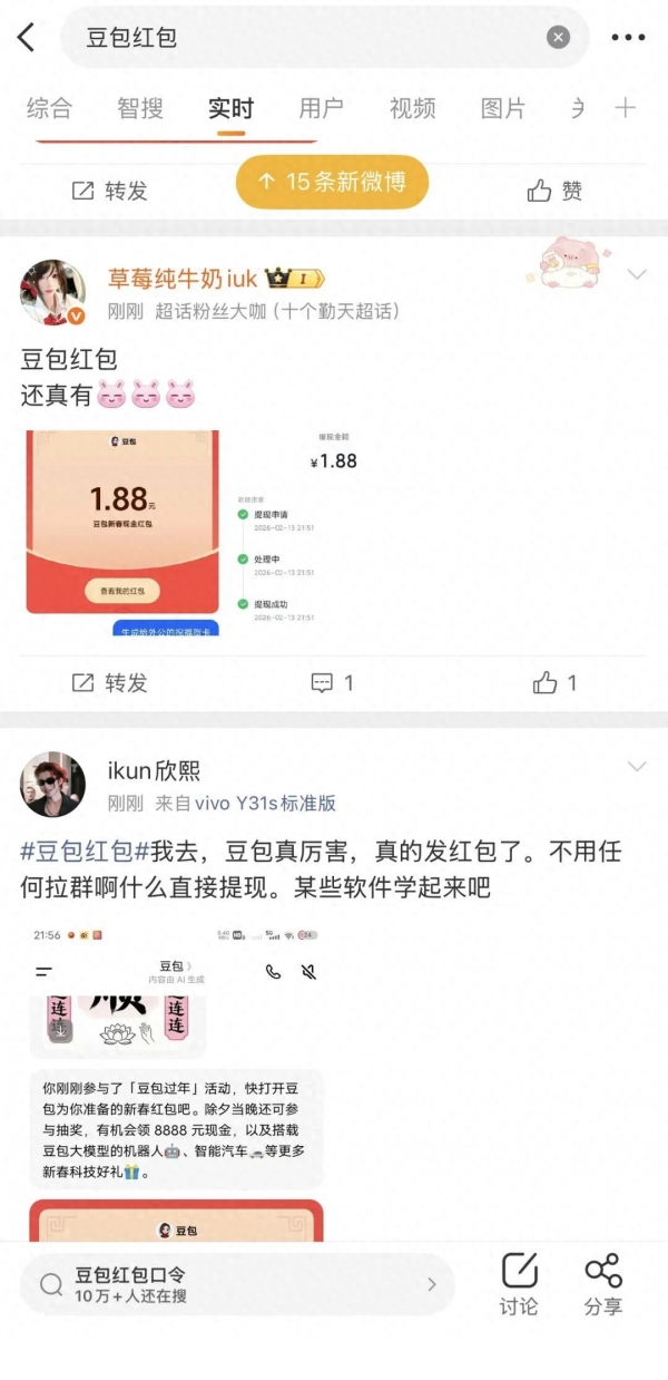 2月13日晚,"豆包过年"新春活动第一阶段正式启动,"豆包红包"话题词冲上热搜。
