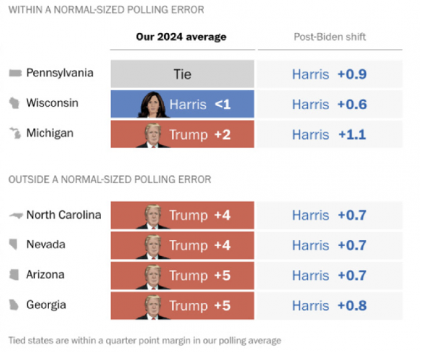 哈里斯接替拜登之后在几乎所有摇摆州的领先优势均有所上升
