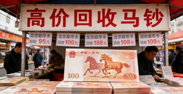 线下市场早已一片火热。在北京马甸邮币卡市场,"高价回收马钞、马币"的招牌随处可见,1月21日普通马钞回收价在36元-40元区间,较面值溢价80%-100%;配套发行的马年纪念币(面值10元)回收价13元-16元,溢价略低。号码成为价格分水岭:无4、7的"吉祥号"溢价更高,后三位相同的"豹子号"单张回收价超百元,尾号"888"的极品靓号甚至叫价520元,溢价达25倍。商家推出的"钞币礼盒"溢价更惊人,内嵌马钞、马币的基础款售价70元,搭配邮票的套装则涨到110元。
