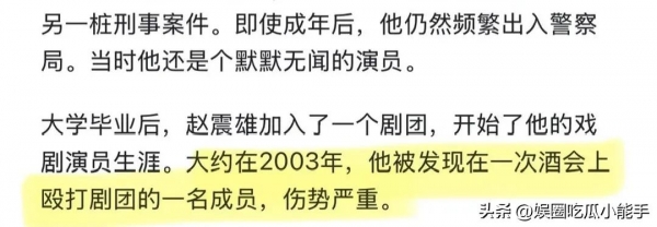 不仅无证驾驶,还随意殴打打人,成年后仍旧频繁的出入警察局,用的"赵震雄"的艺名还是他父亲的名字,真是离谱。
