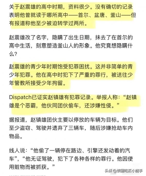 根据报道,赵震雄本名为赵元准,使用艺名"赵震雄"也是为了掩盖自己高中时期作为"少年犯"的严重犯罪记录。