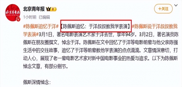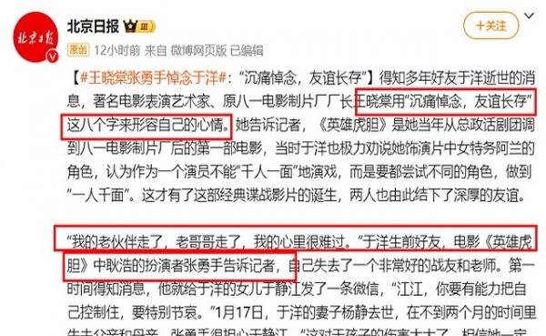 如今,在于洋的追思会上,王晓棠捧着他最爱的君子兰,陈佩斯念出他手写的导演心得,张勇手展示着1948年《桥》的场记本。