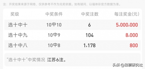 快乐8的"选十中十"是该玩法的最高奖级(需从20个开奖号中精准选中10个),本期共开出6注,全部出自江苏地区: