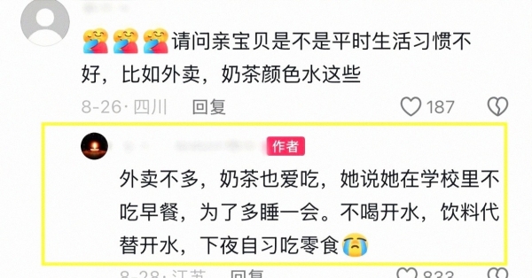 她不是在指责学校,更像是在自责--住校那几年,女孩把许多人不以为意的小习惯,一点点攒成了"坏账":为了多睡15分钟不吃早餐,口渴只喝奶茶和饮料,白水嫌淡从来不碰,白天没时间吃,晚上靠外卖和零食顶着