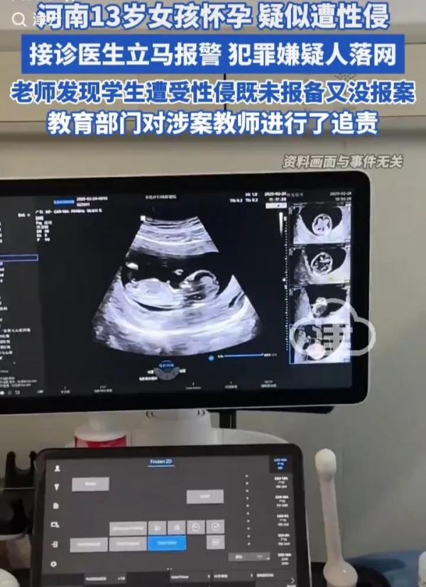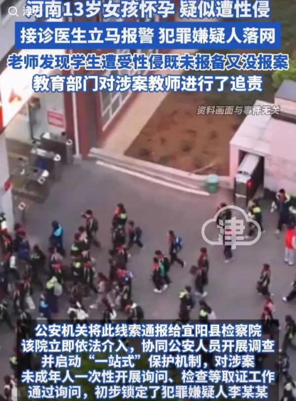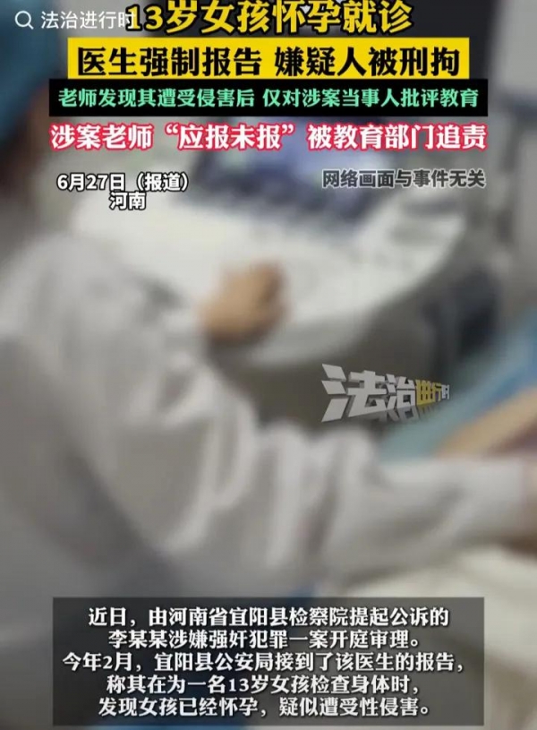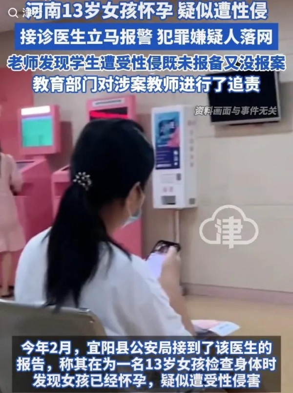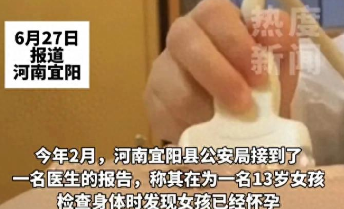 据新闻媒体报道,今年2月,河南省宜阳县公安局接到了一名医生的报告。这名医生称:自己在为一名13岁女孩做身体检查时,发现女孩怀有身孕,怀疑女孩遭到了性侵害。