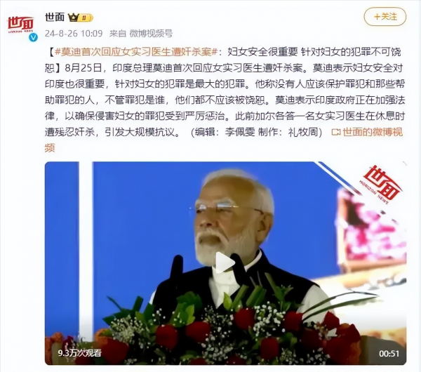 莫迪总理对此也做出了回应,针对最近一名实习女医生遭受强奸的事件,他强调要保护印度妇女的权益,并对任何犯罪行为进行严厉的惩处。