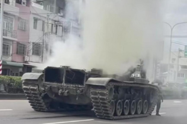 就在海上剑拔弩张的同时,岛内陆地上演了闹剧。为了"因应"解放军演习,台陆军紧急调动士兵,结果29号上午,一辆正在高雄街头行驶的CM-11"勇虎"式坦克,毫无预兆地冒出滚滚浓烟,直接瘫在了路中间。