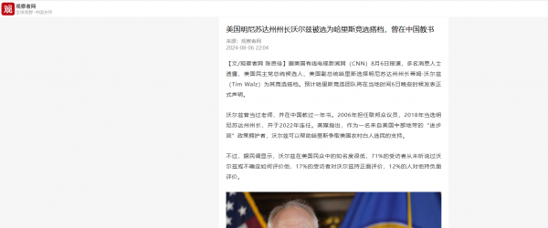 很快哈里斯选择的副手名单公布,而此人的出现再一次提升了哈里斯在竞选中获胜的概率。