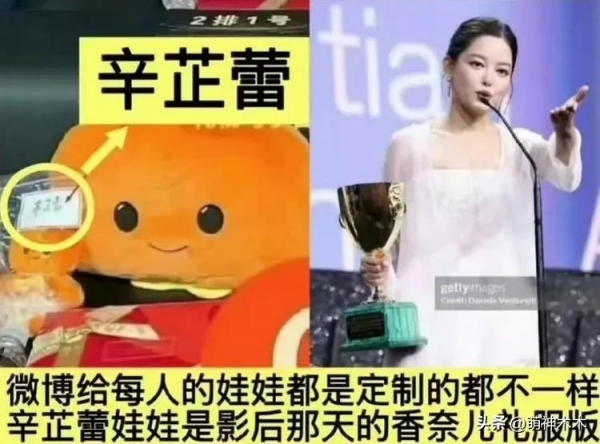 除此之外,有网友发现辛芷蕾的定制娃娃也出问题了。据悉,辛芷蕾的娃娃是赞助商根据她在威尼斯领奖的穿搭定制的,但微博之夜上,辛芷蕾拿的是一个蓝色的娃娃,疑似是杨幂《生万物》里的造型。