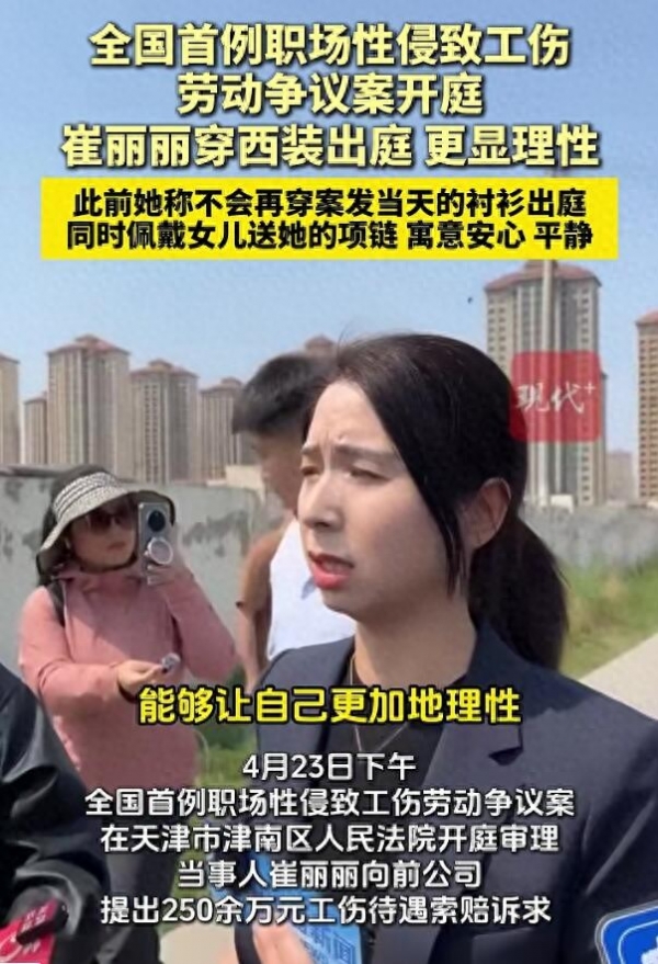 备受关注的全国首例"职场性侵致精神工伤认定案",4月23日下午在天津市津南区人民法院八里台人民法庭开庭审理。法院将实质审理工伤待遇等13项诉请,崔丽丽提出250余万元工伤待遇诉求。当天下午1点半左右,崔丽丽现身法庭外,她没有像上次开庭时穿案发当天的衬衫,而是穿了一件西装。她表示,穿西装出庭更理性。同时,崔丽丽还佩戴着女儿送她的心形项链,寓意着安心、平静。她表示,"想要一份公正的判决,继续捍卫自己作为职场女性的尊严和权益。"