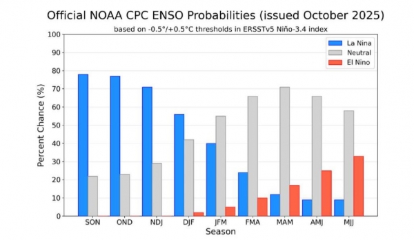 初步预计可能持续到2025年12月到2026年2月,2026年1月至3月可能会转变为厄尔尼诺、中性状态、有55%的可能性。